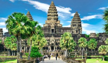 Angkor Wat is a temple complex in Siem Reap, Cambodia which is the largest religious monument in the world. It is an awe inspiring UNESCO World Heritage site with its five lotus like towers rising 65 meters into the sky. The temple was built by Suryavarman II, dedicated to Lord Vishnu, Shiva and Brahma of Hindu mythology who are the three principal gods in the Hindu pantheon.